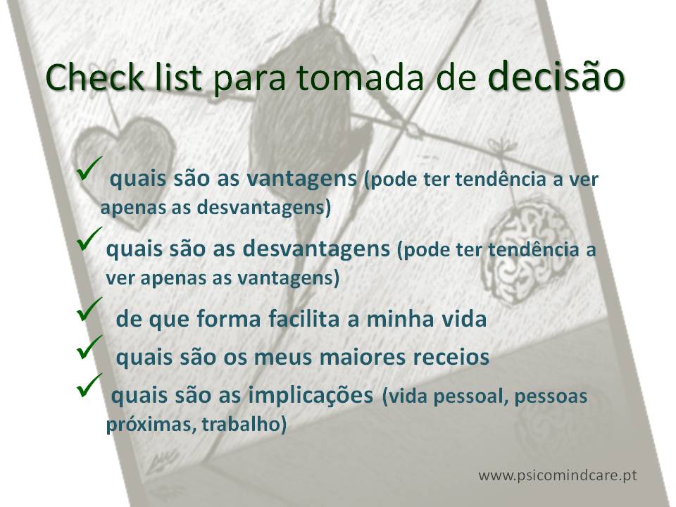 Para facilitar a decisão importa balancear e procurar um equilíbrio entre o pensar e o sentir. Uma boa ajuda será criar um horário/calendário (com o detalhe que entender necessário), em que numa das colunas coloca o que pensa que vai acontecer e noutra coluna o que idealiza que irá sentir. Procure recolher, antecipadamente, a maior informação possível e não tenha medo de parecer exaustivo/a. Afinal trata-se de algo muito importante: a sua existência e a sua felicidade.